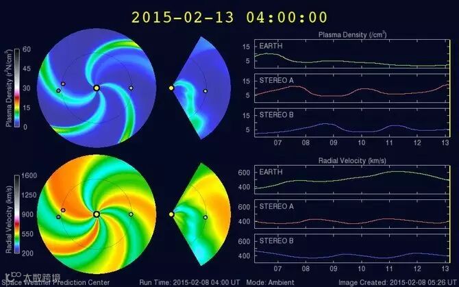 图3.美国国家天气预报中心提供的1-4天地日空间等离子体密度(Plasma Density)及径向速度(Radial Velocity)预测,中心黄色圆点代表太阳,右侧在黑色轨道线上的绿色点代表地球。