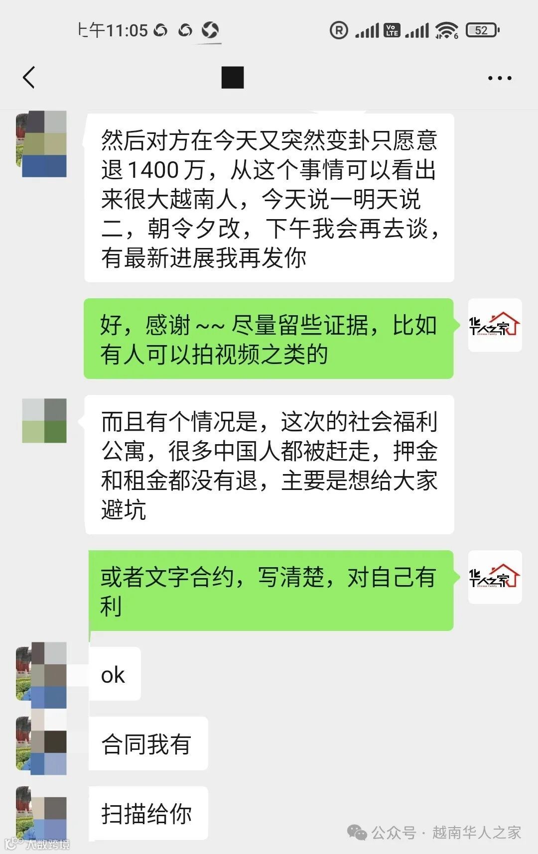 然后对方在今天(5号)又突然变卦只愿意退1400万,从这个事情可以看出来很大越南人,今天说一明天说二,朝令夕改,下午我会再去谈,有最新进展我再发你。