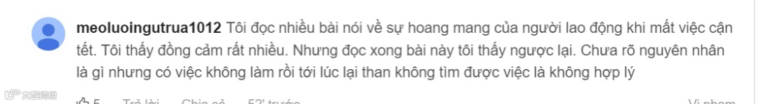 meoluoingutrua1012:我读了很多关于工人在临近春节时失去工作十分困扰的文章。我感到很同情。但读完这篇文章,又是完全相反的。不清楚是什么原因,但有工作不做,到时候找不到工作又感叹是不合理。