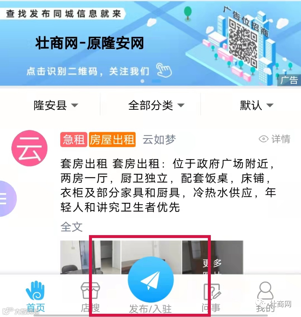 壮商网-原隆安网便民发布平台专注为隆安人提供便民信息发布/查询服务。为您提供房屋出租、生活服务、招聘求职、找房子、家政服务、征婚交友、房租出售、二手交易、失物招领、同城服务、生意转让等海量分类信息,充分满足您免费查看/发布信息的需求。