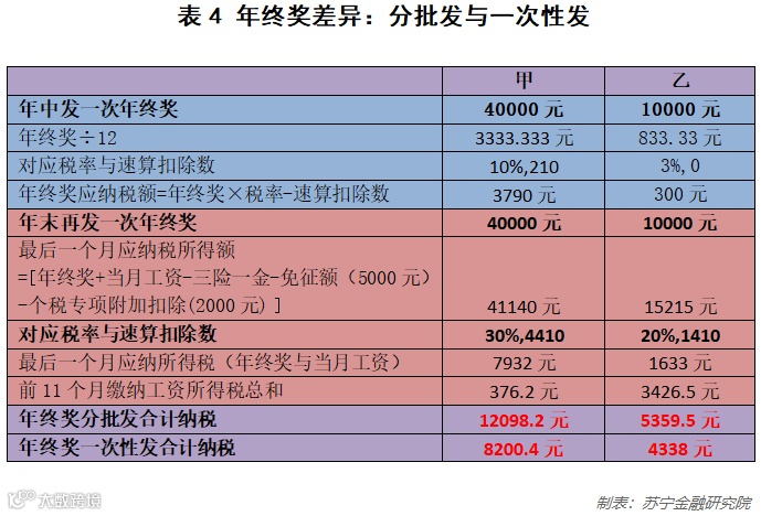 税法规定,在一个纳税年度内,对每一个纳税人,年终奖的计税办法只允许采用一次,其余情况下都要并入工资作为综合所得计税。这就意味着,分批发的时候,只有其中一次可以采取年终奖扣税方法,其他需合并在工资里缴纳个人所得税。沿用上表3案例,假设甲乙的年终奖分两次发,年中发一半,年末发一半,年中那一半按年终奖扣税方法计算,年末那一半直接和工资合并纳税,则交税情况如下表4。