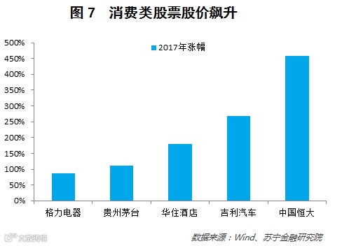 这一轮房地产周期也充分反应在了资本市场中。不论是购置大房子、春节买高端白酒,还是更换家电、购买汽车、外出旅游住星级酒店,消费升级既与日常生活紧密相关,也反映在相关股票的股价之中。地产、白酒、家电、汽车、酒店相关股票在2017年都有80%至460%的涨幅(参见图7)。