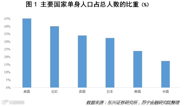 其实,从全球范围来看,单身并不稀奇,甚至可以认为是“常态”。根据东兴证券研究所的报告,单身人口已占到美国成年人口的45%,日本为32.4%,韩国为23.9%,中国只有17.4%。