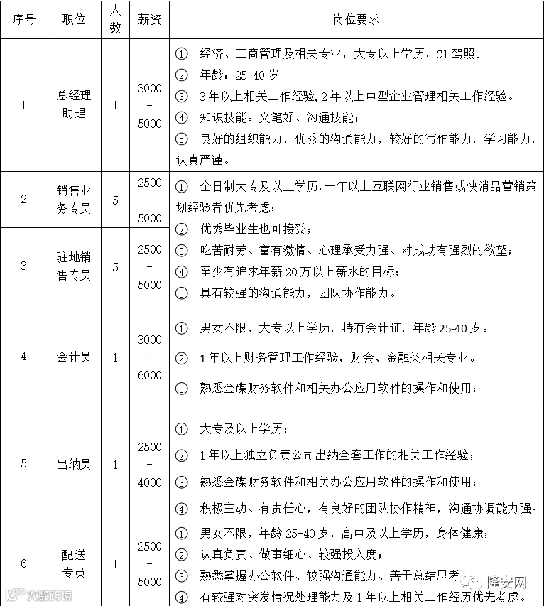 岗位要求:吃苦耐劳,身体健康,有团队精神,服从安排,立足岗位,责任心强。