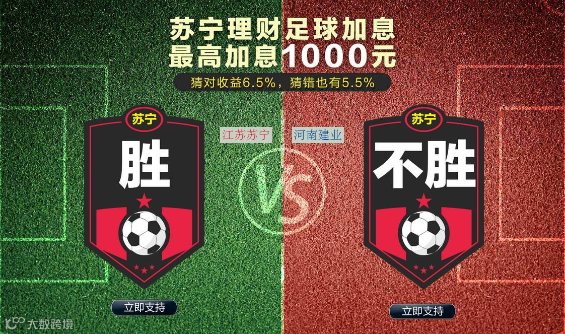 观看7月24晚苏宁足球队比赛的用户还可参与专场足球理财活动,用户购买预期年化收益率为5.8%的理财产品,只要预测比赛结果与购买的产品类型相一致,所购理财产品的预期年化收益率将增加1%,至6.8%。