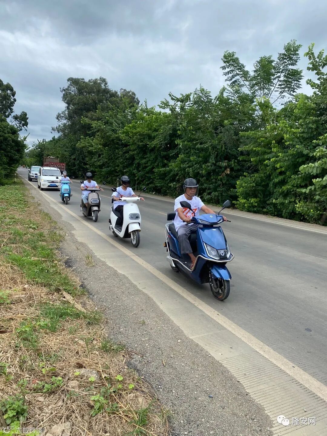 两个成年人硬是把电动车骑出了划龙舟的感觉。