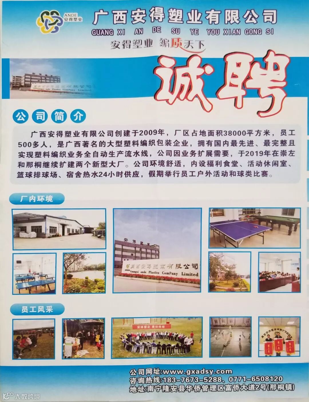 广西安得塑业有限公司创建于2009年,厂区占地面积38000平方米,员工500多人,是广西著名的大型塑料编织包装企业,拥有国内最先进、最完整且实现塑料编织业务全自动生产流水线,公司因业务扩展需要,于2019年在崇左和那桐继续扩建两个新型大厂。公司环境舒适,内设福利食堂、活动休闲室、篮球排球场、宿舍热水24小时供应,假期举行员工户外活动和球类比赛。