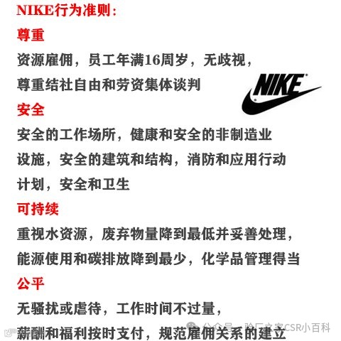 Nike验厂依据为公司社会责任守则,包括强迫劳动、童工、工资报酬等八大标准:
