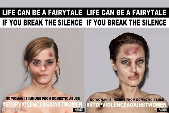 几年前,西班牙艺术家Alexsandro Palombo为呼吁社会关注家庭暴力,和好莱坞一众女星合作拍摄了一组“反家暴”的照片,艾玛·沃特森,安吉丽娜·朱莉等都参与其中。