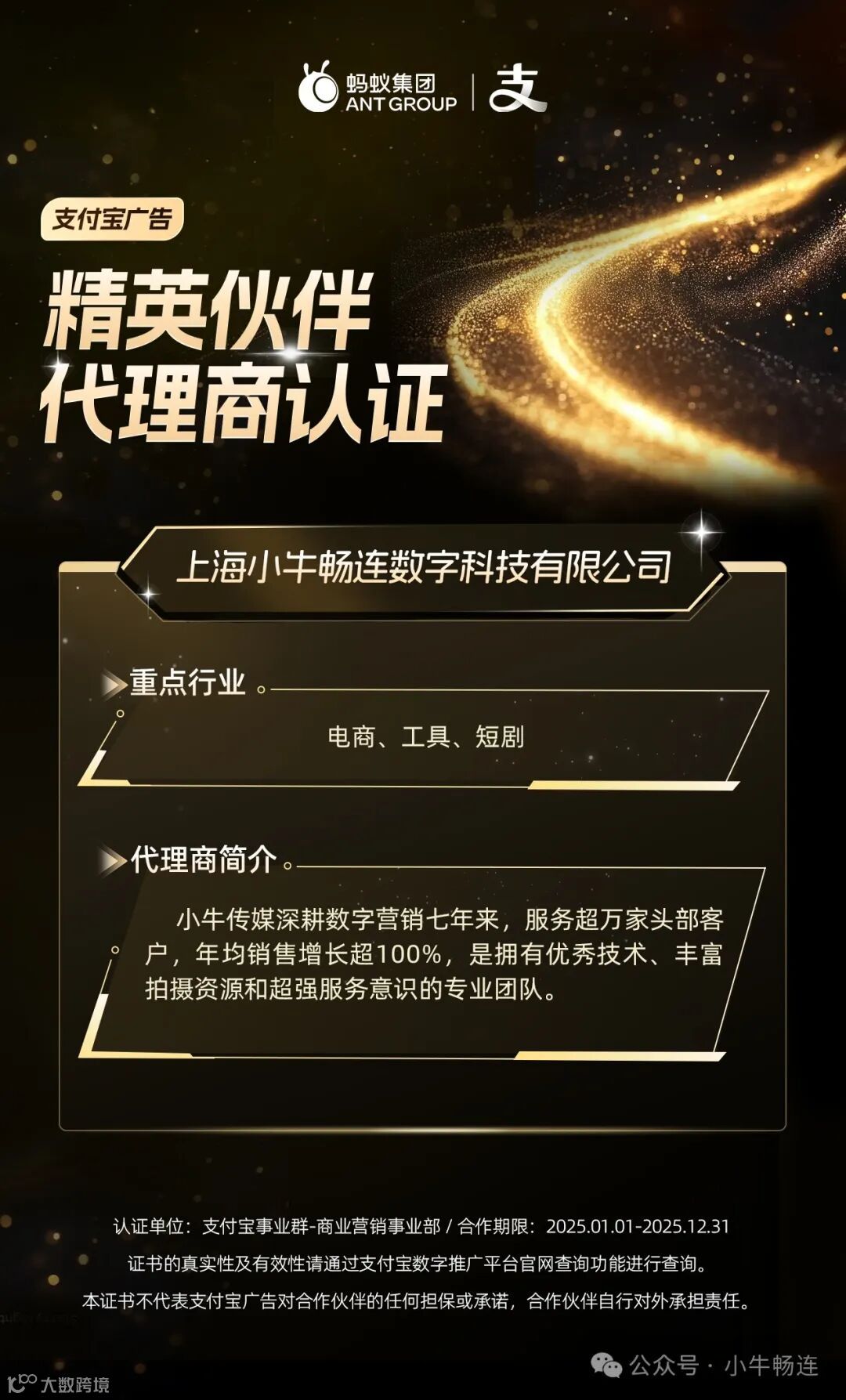 本次认证,充分证明了上海小牛畅连数字科技有限公司在支付宝广告生态中的实力与服务能力;未来,我们将继续与平台紧密协作,在场景应用、数智营销与内容创意等领域,为客户提供更高效、更精准的营销解决方案与服务,在支付宝广告快速增长的过程中持续达成客户生意目标。