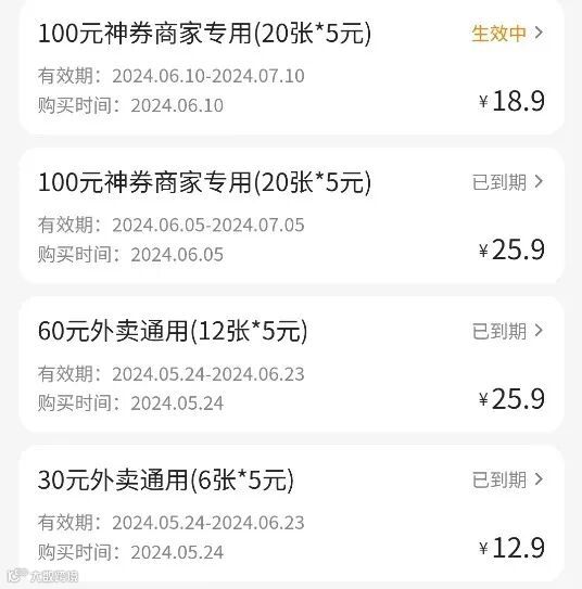 PConline也是在购买记录中发现,从6月份开始购买的券包,就已经从“外卖通用”变成“神券商家专用”,这意味着,早在正式升级会员体系前,美团的会员优惠券,就不再“无门槛”了。