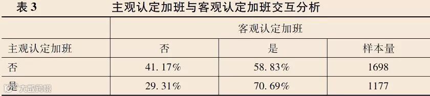 表3对主观认定加班与客观认定加班进行了交互分析,发现主观认定加班与客观认定的加班重合度较高,尤其是在发生加班的情况下。即主观认定发生了加班的受访者中有70.69%的人实际也发生了加班。但是主观认定加班与客观认定加班也不完全一致,主观认定没有加班的受访者中,有58.83%的受访者客观上发生了加班,同时主观认定加班的受访者中有29.31%的受访者客观上没有发生加班。