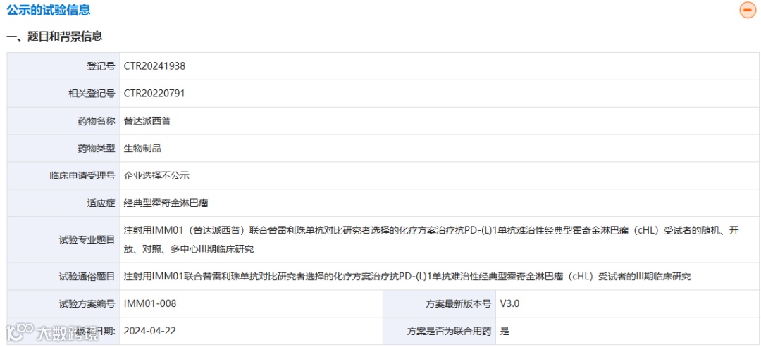 替达派西普于2019年8月进入I期临床阶段。截至目前,宜明昂科就该药物已申请了3项III期临床试验,分别针对经治cHL、初治骨髓增生异常综合征(MDS)、初治慢性粒-单核细胞白血病(CMML)。