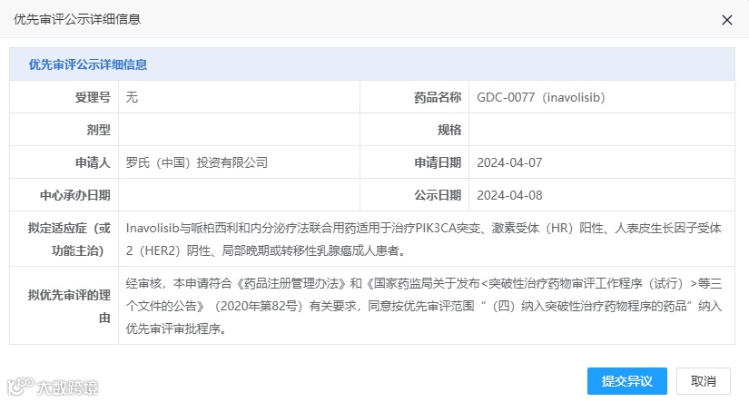 4月8日,CDE网站显示,罗氏的PI3Kα抑制剂inavolisib拟纳入优先审评程序,用来与哌柏西利和内分泌疗法联合用药治疗PIK3CA突变、激素受体(HR)阳性、人表皮生长因子受体2(HER2)阴性、局部晚期或转移性乳腺癌成人患者。