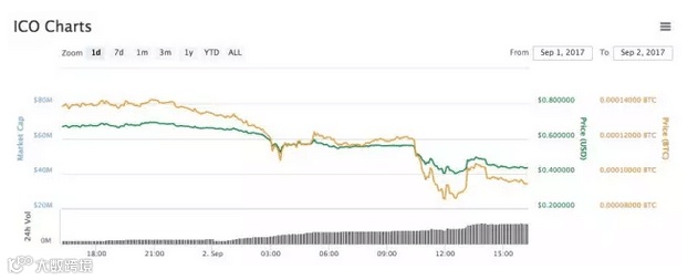 9月2日,在ICO领域带有风向标性质的ICOCOIN,暴跌近36%,总流通市值在24小时内蒸发约2440万美元(约合人民币1.6亿)。