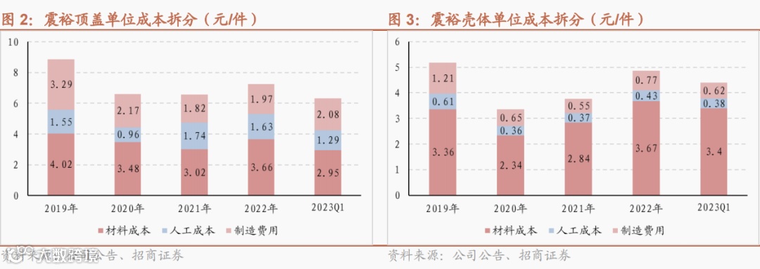 从成本拆分看,2023年Q1壳体业务的单位人工成本、制造费用约0.38、0.62元/件,分别较2022年下滑11.6%、19.5%,规模效应开始初步显现,即公司壳体业务实现盈利。而2023年H1顶盖业务的单位制造费用约2.2元/件,较2022年增长11.6%,主要系顶盖业务收入同比下滑约30%,新增的固定资产折旧及摊销较大,规模效应较差,同时2022年产品质量问题后公司为保证份额,在价格上有所让步。2023Q1顶盖平均售价较2022年下滑12.5%,而壳体降幅约5%。