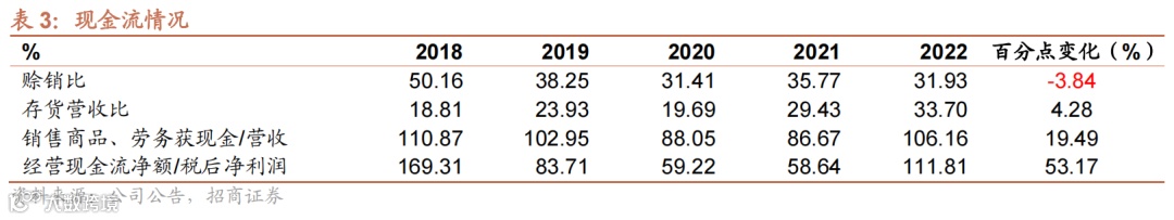 【现金流】2022年公司经营性现金流净额为5.28亿,同比大幅增长183.21%,主要系公司销售商品、提供劳务收到的现金增加。经营现金流净额/税后净利润为111.81%,同比增加53.17个百分点,公司现金流健康,盈利质量扎实。
