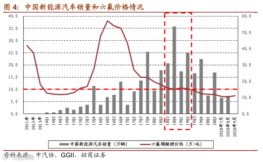 根据供需情况推测,预计未来几个月价格有望回归至10万元/吨附近。2020年下半年至2021年上半年的全球新能源汽车需求景气度,将超过2018年下半年至2019年上半年,同时电动工具、电动两轮车、3C及储能等市场需求景气度也在持续提升,而供给方面,过去2年六氟行业基本没有新增有效产能投产。因此,预计未来几个月六氟价格大概率会回归到2018年下半年至2019年上半年10万元左右的价格附近。