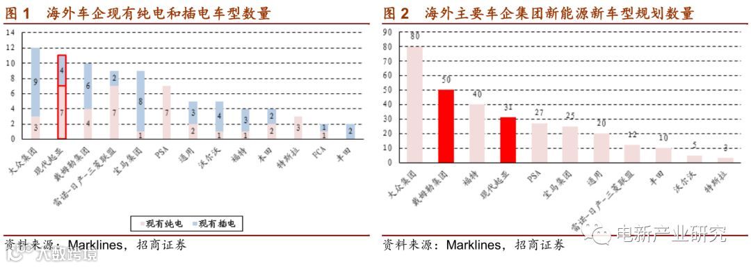 2018年现代起亚电动车销售迅猛增长。2018年现代起亚电动车销量达6.3万辆,同比大增147%。其中纯电和插电销量约4和2.3万辆,同比增长105%和289%。销量大增主要是公司在2017-2018年推出4款车型后,总车型数量达到11款,在海外车企中仅次于大众。现代起亚在2018-2025年规划新的电动车型共31款,位居海外车企规划的前列,在电动化领域大手笔投入,预计将保障公司销量持续高增长。
