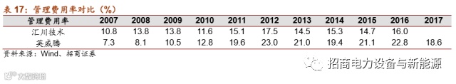 费用率有改善趋势。公司毛利率上市以来一直维持在40%左右,净利率波动幅度却比较大,主要由于公司管理费用率、销售费用率增长所致。2017年公司管理费用率同比下降4.3个百分点(剔除研发费用影响后下降2.1个百分点),公司的销售费用率下降2.7个百分点,有明显改善趋势。同时,对比业内同行汇川技术,公司管理费用率、销售费用率仍有较大改善空间。