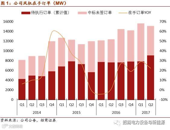 3.风机在手订单充足,持续研发投入不断增加公司竞争力:上半年公司2.5MW风机销量同比增长95%、而1.5MW销售下降超过73%,大型化趋势明显,同时公司在手订单达15GW,充足的订单为未来收入提供保障。另外公司不断研发新机型,同时积极获取国际机构认证,国内外竞争力不断增强。