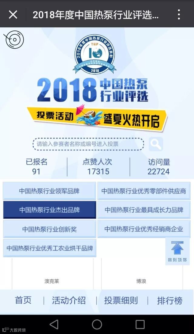 ☑点击中国热泵行业杰出品牌按钮,选择31号欧科,点击爱心按钮,为EK投票。