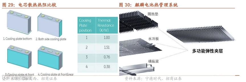 侧冷和双冷板设计。电芯本身占了总热阻的64%,而电芯大面的双面散热热阻大约为底部热阻的1/3,因此冷板双面侧冷的效率显著高于传统的底部水冷。宁德时代的麒麟电池和特斯拉4680电池均使用了侧面冷却技术,其中麒麟电池通过多功能弹性夹层将电芯侧面的热量带到水冷板处交换出去,特斯拉则通过在4680电池侧面的循环水道将电芯侧面的热量带走。