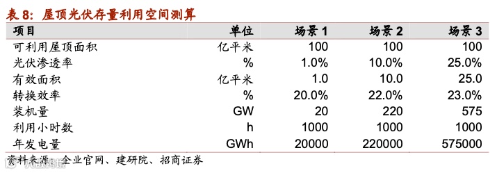 据中国建研院,目前国内既有建筑面积600亿平米,可利用屋顶面积大致为100亿平米。分别假设光伏屋顶渗透率分别为1%、10%、25%,测算装机空间达到20、220、575GW上下。
