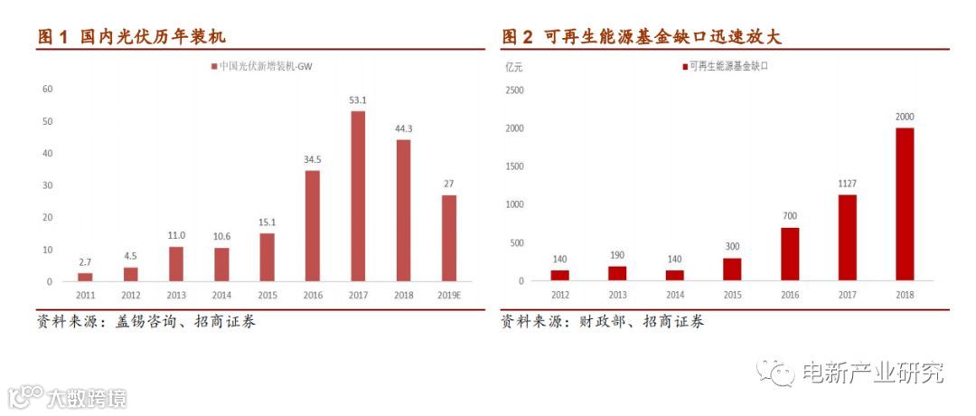 2016年开启的PERC浪潮带来光伏电站平准化度电成本(LCOE)迅速下降,而补贴政策未及时调整,导致装机规模失控--2015年国内装机仅15GW,2017年骤增到53GW,由于补贴定价不定量,光伏补贴增长速度远远超过财政预算,可再生能源基金缺口迅速放大,2018年基金缺口近2000亿元,最终导致2018年531新政出台,并对国内光伏装机带来巨大冲击。