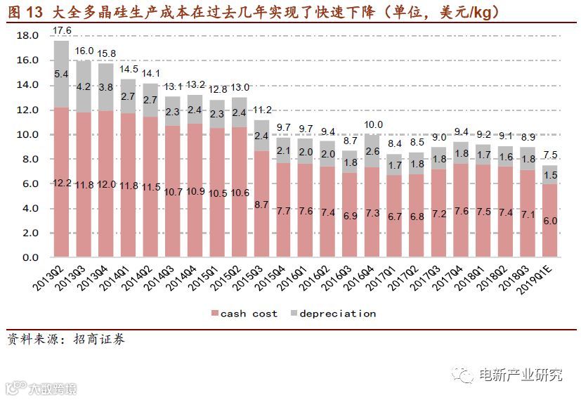 同时,通过新投产能、低电价区域建厂、持续工艺优化、精益化管理,优势公司的成本在过去几年以及未来几年都保持快速下降的趋势。大全多晶硅生产成本从2013年的17.8美元/kg,下降到了2018年的8.9美元/kg,六年下降了50%,以及2019年1季度3B项目达产后,电费将继续降低,成本可能达到7.5美元/kg。