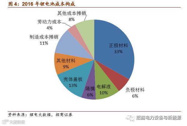 围绕动力电池产业链布局完善,盈利能力领先同行。2015和2016年,公司电池组毛利率分别为48.71%和48.72%,大幅高于行业竞争对手。其中,产业链整合是高毛利率的重要原因。公司围绕动力电池产业链布局完善,涉及正负极、隔膜、涂碳铜铝箔等,有望在洗牌中保持领先同行的盈利能力;在锂电池成本构成中,正极材料、负极材料、隔膜、电解液、铜/铝箔的成本占比超过50%。目前公司产业链布局已基本覆盖主要电池材料。