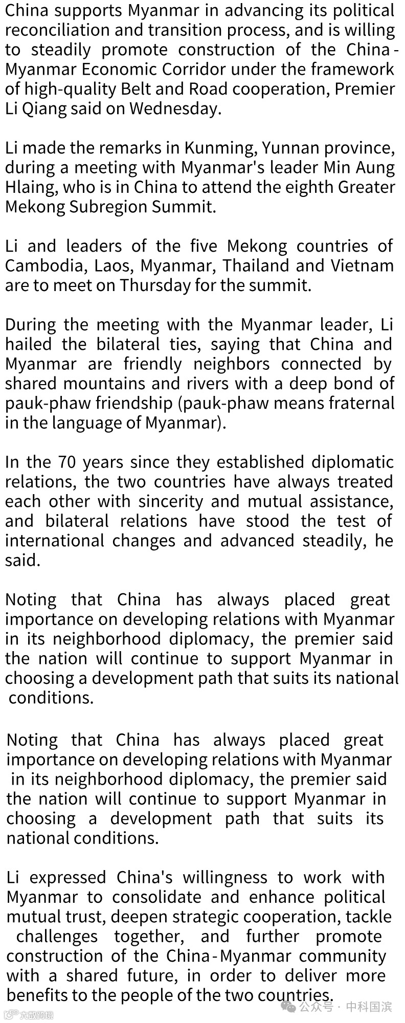 Premier hails fraternal bond, says Beijing supports neighbor's transition process