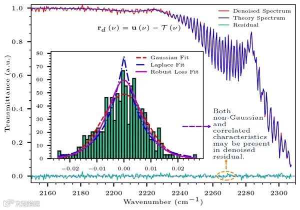 在实际浓度反演过程中,传统最小二乘等方法受到噪声和基线漂移等光谱干扰的影响,其气体光谱定量结果准确性受限。为提升浓度反演精度,团队提出了 “抑制 - 适应 - 优化”模型,实现了光谱降噪、残差建模以及损失优化的有机结合,为FTIR光谱的浓度反演提供了一种更具鲁棒性的方法(王钰豪,Optics Express 2025)。该模型融合光谱降噪、残差建模与损失优化技术,能为工业监测、交通排放等场景的浓度反演提供鲁棒方案。该算法首先通过噪声抑制技术提高用于反演的光谱数据的质量,然后利用Ljung-Box检验和分位数-分位数图等统计工具对降噪后光谱数据与前向模型的残差分布进行分析,并采用Barron提出的广义损失函数进行适应,最后采用Yogi优化器进行损失优化,实现气体浓度反演。模拟和实验光谱验证了该模型在均方根误差噪声为1×10-3光谱数据集中的性能,相比于传统方法,可以将CO2、N2O和CO的反演精密度提高15%。实验结果表明,该方法在工业监测、环境研究以及交通排放等领域具有广阔应用前景。