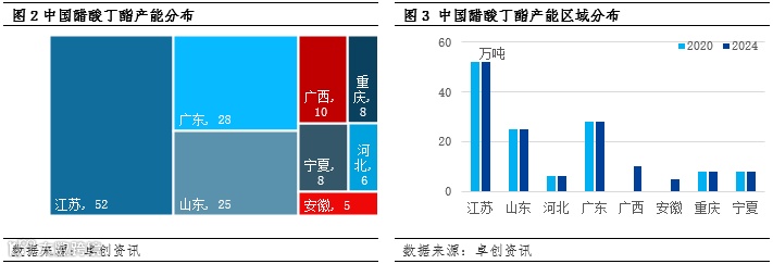 醋酸丁酯行业已发展成熟,下游市场需求有限且较为分散。当前国内醋酸丁酯生产企业多为民营企业,其中年产5万吨以上的企业仅有11家。受原材料供给和市场需求分布影响,该产品的产能主要集中于江苏省和广东省。江苏省年度总产能为52万吨,占比全国产能的37%;广东省总产能为28万吨,占比20%。