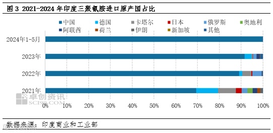 印度是全球重要的三聚氰胺需求市场,印度当地的产能较难满足国内日益增长的应用需求,市场对进口的依赖程度较深,中国则为其主要进口来源地。从印度进口原产国方面看,最主要是进口于中国。2022-2023年从中国进口总量均达到6万吨,占比达到90%以上;2024年1-5月份从中国的进口量4.8万吨,占比更是高达99.9%。其他少部分则进口于德国、卡塔尔、日本、俄罗斯、奥地利等国家。