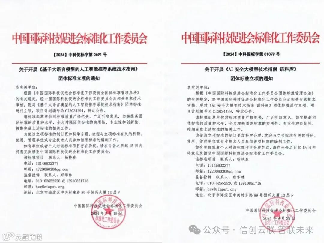 为深入贯彻落实党中央、国务院关于加快发展人工智能的部署要求,贯彻落实《国家标准化发展纲要》《全球人工智能治理倡议》,进一步加强人工智能标准化工作系统谋划,加快构建满足人工智能产业高质量发展和“人工智能+”高水平赋能需求的标准体系,夯实标准对推动技术进步、促进企业发展、引领产业升级、保障产业安全的支撑作用,更好推进人工智能赋能新型领域,经过中国国际科技促进会标准化工作委员会及行业专家的技术审核,正式批准立项两项重要的团体标准:《AI安全大模型技术指南语料库》和《基于大语言模型的人工智能推荐系统技术指南》。