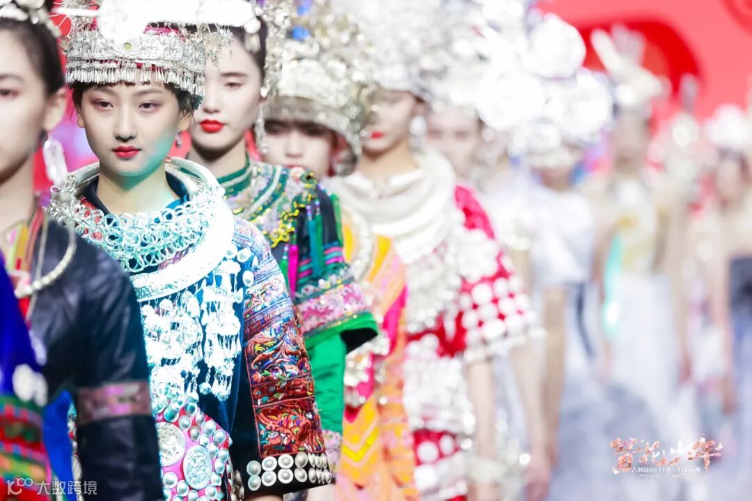 《簪花少年》大秀,以苗绣为基础,融入了侗族、水族、布依族等多民族的元素;同时加入了蜡染,亮布、织锦、绸缎、苗族银饰等非遗工艺,结合时下最流行、出彩的泉州簪花,一场时尚大秀就此拉开。