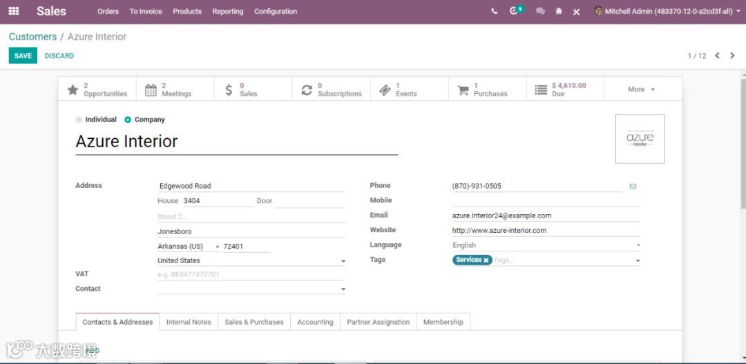 也可将所选的 联系人 作为 客户 或 供应商(从他这里采购)。您可以从下拉菜单授权销售人员或创建一个新的销售人员。