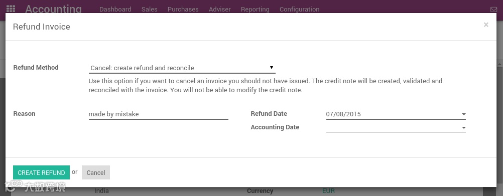 Odoo会自动生成退款草稿。最终客户可以修改退款并进行验证。稍后通过邮件将退款发送给客户。