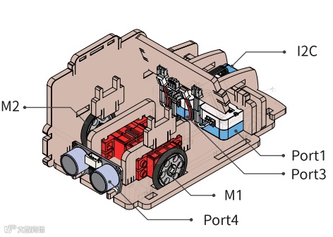 由于本次案例不包含巡线功能,所以图纸中出现的灰度和激光测距模块可以忽略,可以看到小车的左轮接M2接口,右轮接M1接口,超声波接M4接口。(具体的拼装过程可以参考套件说明书,这里不展示细节)