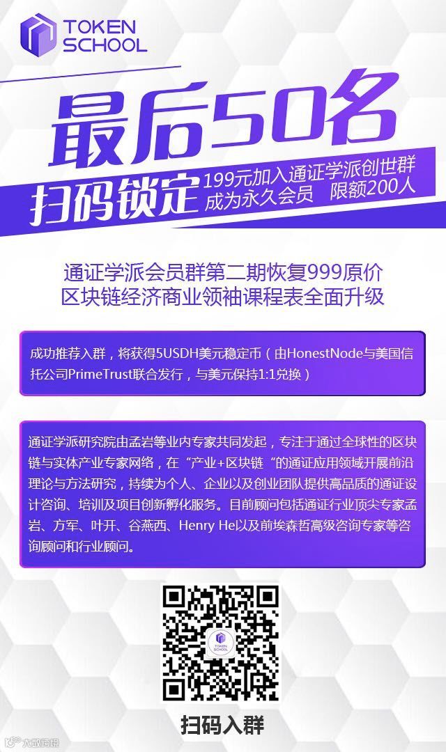 限额200人的创世群仅余最后50个名额,199元加入通证学派创世群成为永久会员,请立即扫描下方海报二维码,锁定最后的名额!