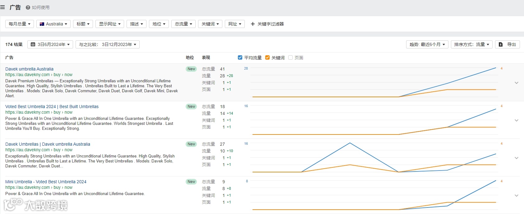 根据ahrefs数据显示,Davek投放的付费更高,都强调了其核心卖点,即高质量和耐用性,并用到了“一辈子用的伞”这样的关键词,这是能够吸引关注产品质量的消费者的注意的。