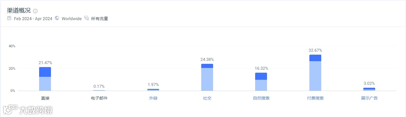 根据similarweb数据显示,Davek官网的流量主要来自于付费搜索(32.67%)、社交媒体(24.38%)、直接访问流量(21.47%)、自然搜索(16.32%)。