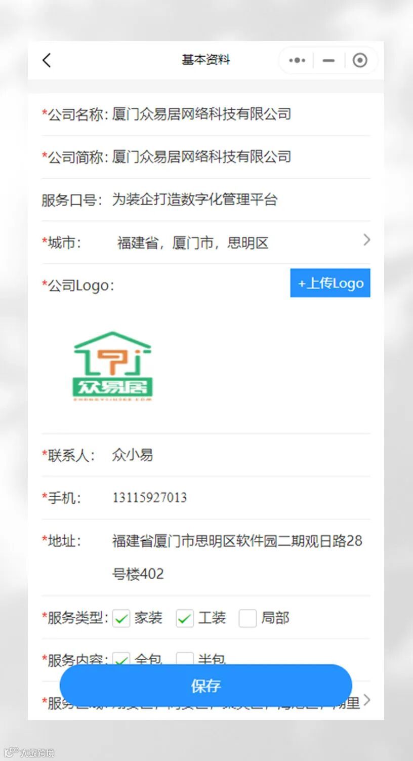 填写公司名称、公司简称、服务口号、城市、公司Logo、联系人、手机、地址基本信息,勾选公司服务类型、服务内容、服务区域信息后,点击保存操作按钮即可完成对公司基本资料的编辑操作