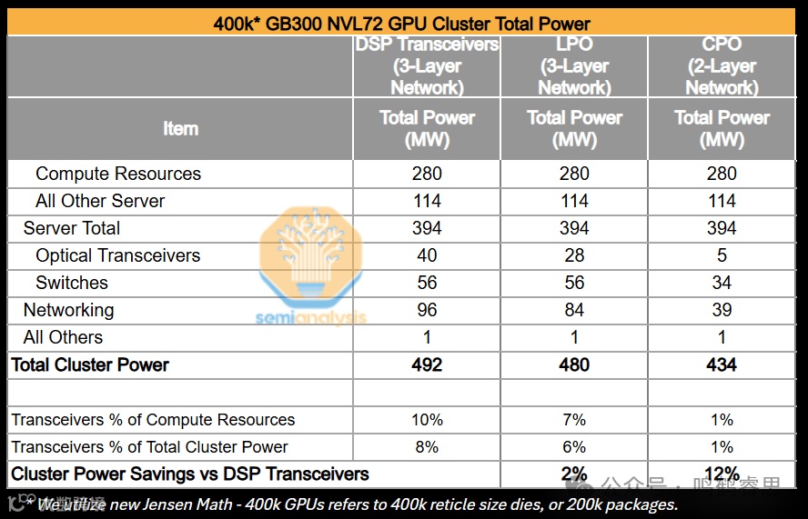 我们的分析表明,对于一个40万节点的GB200 NVL72部署,从基于DSP收发器的三层网络转换为基于CPO的两层网络,可使整个集群的功耗最多降低12%——将收发器的功耗从计算资源的10%降低到仅1%。