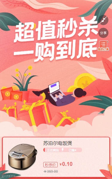 母亲节期间使用人人秀设置秒杀活动,可以通过超值的优惠价格快速吸引用户的关注,促进用户参与活动,秒杀活动设置简单方便,可自定义商品原价、秒杀价、秒杀时间、抢购数量等,用户在设定好的规则里进行秒杀抢购,强化用户的紧迫感。