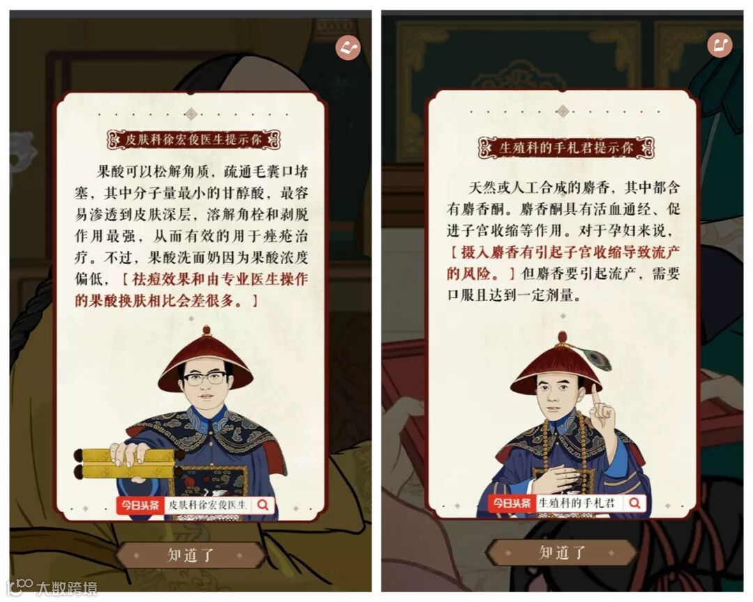 策划步骤:①开头为主人公在家中看古装剧场景,忽然被电视机卷入,睁开眼来到古代后宫,开启宫斗生存挑战;②生存挑战的内容为女主从宫女一步步当上皇后间遇到的场景选择,如“高贵妃为皇后送来含麝香的鸡汤”、“为皇上选择正确的抗痘洗面奶”、“阿哥落水怎样救助”...一共8道题,每答完一道题都会显示题后隐藏的详细的医学知识与一位太医的图片,如麝香会致堕胎、抗痘应用含果酸的洗面奶...③最后根据答对题数得出生存指数和最高级别,长按可保存结果图片,点击“关注太医赢香囊”可跳转参与出品方活动。