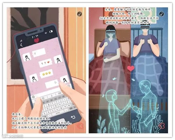 通过漫画的形式回忆了恋人们在不同年代表达爱意的方式