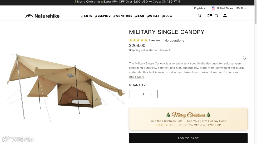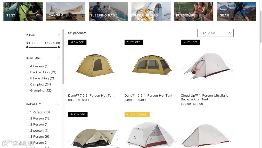 不同于欧美品牌主攻高端市场,Naturehike 定位更广泛的普通消费者,包括户外新手和家庭用户。产品价格区间从 69 美元至 1661 美元,覆盖基础到豪华露营需求,广泛触达潜在客群。