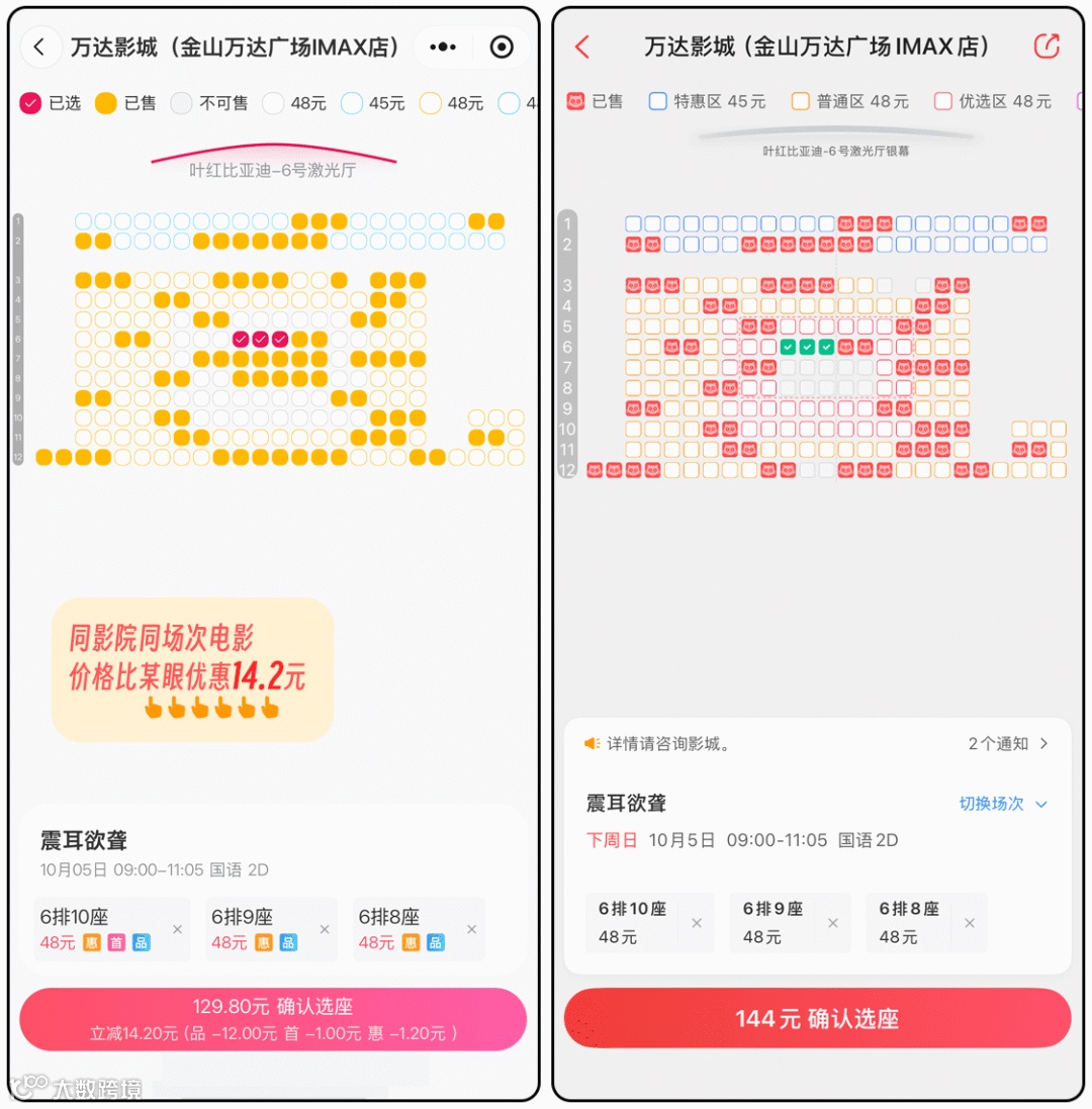再来对比下同场次的电影票价格